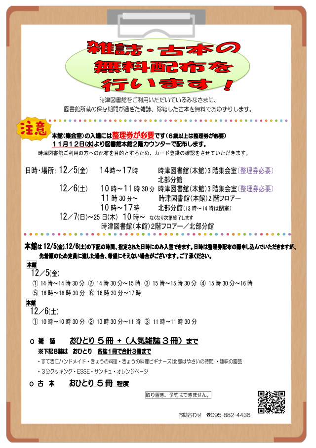 時津図書館をご利用いただいているみなさまに、図書館所蔵の保存期間が過ぎた雑誌、除籍した古本を無料でおゆずりします。 本館(集会室)の入場には整理券が必要です。11月12日(水)より本館2階カウンターで配布します。詳しくは下記のポスターをご覧ください。 (クリックすると大きく表示します)
