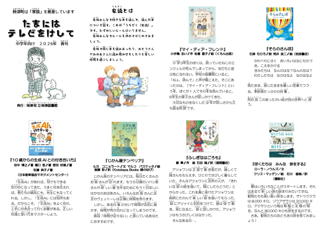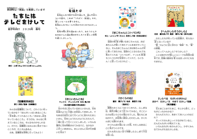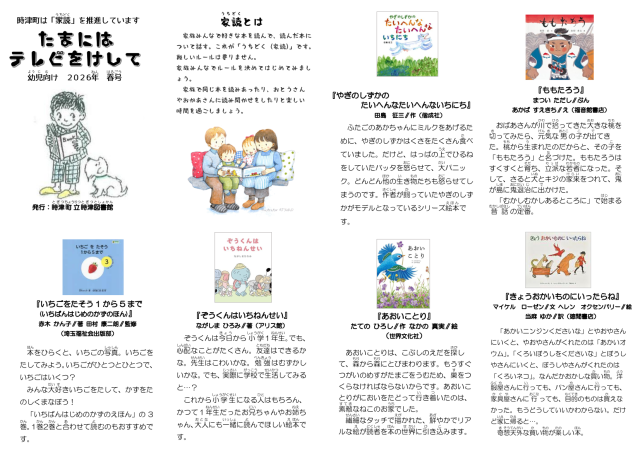 時津図書館職員が家読(うちどく)におすすめの本を選びました。どんな本を選んだらいいか悩んだらぜひ参考にしてください。 (クリックすると大きく表示します) (幼児向け) (低学年向け) (中学年向け) (高学年向け)